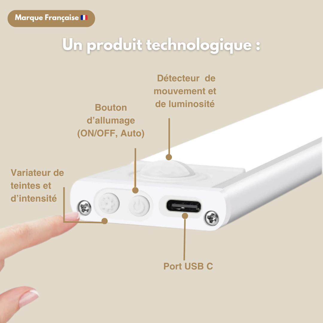 Nos réglettes se règlent en un geste : ajustez la teinte et l’intensité avec le variateur, choisissez l’allumage manuel ou automatique grâce au petit bouton, et rechargez-les facilement via le port USB-C.